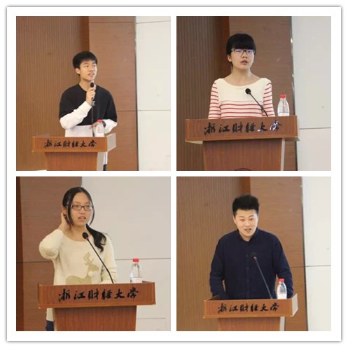 最后,4位今年以优异成绩考上国内外研究生的13级学长学姐依次上台分享了他们出国、考研的经验。叶焕鹏和林易汝分别被英国的巴斯大学和曼彻斯特大学录取。他们就如何选择留学国家、专业院校,如何自己申请公司给出建议,并介绍雅思、托福、GMAT等重要考试,具体推荐了一些有助于加强英语听、说、读、写的平台和资料。而对于国内研究生考试,蔡凯星和田嘉哲在是否报培训班、如何选择辅导教材等方面提出个人见解,并让同学们参考自己在考研阶段的日程安排,告诫大家在学习过程中坚持的重要性。