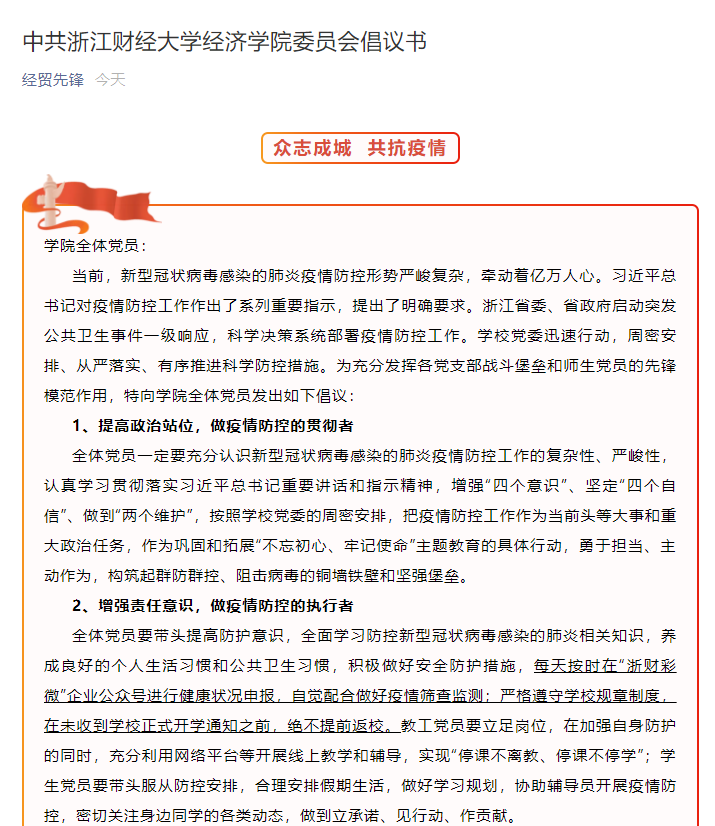 在线上,公司积极向全体党员、员工发出的倡议,每位师生每日定期健康申报,同时公司组织师生积极参与“经院云+”和“四个一”的系列活动。公司教师通过各种线上渠道给员工进行线上教学,云打卡、云健身、云阅读等线上互动成为了全院员工的线上的“云”必修。公司党委积极号召各位党员通过抒发一段感想、拍摄一组图片、制作一个视频、讲述一个故事等来引导同学们进行防护知识科普宣传,提高群众防护意识。