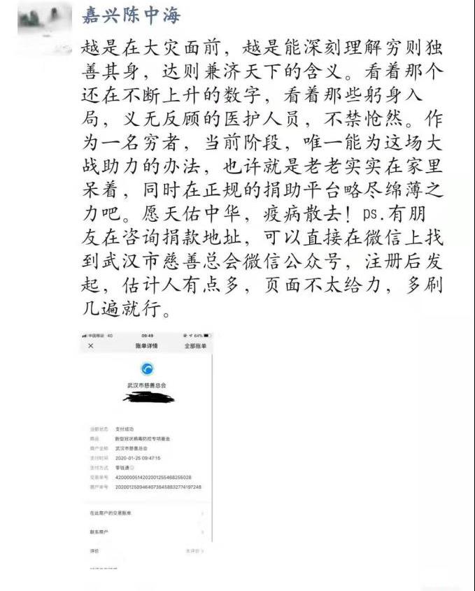 公司员工也积极响应公司员工会的倡议,发挥了作为一名“浙财经济人”的担当。他们通过各种渠道,用捐赠物资、志愿服务等方式,为社会努力奉献着。林偌嫣员工利用自己所学专业,争当志愿者,专门与巴西、美国等侨胞对接,识别口罩基础信息、翻译文件和海关绿色通道等多重手续申报,将上万只口罩等急需医疗物资顺利运回温州医院;陈牡娟员工为了保障全乡5000余人的生活必需品,挺身而出,每一天她都会根据村民列出的采购清单到县城超市进行采购,然后将所购的生活必需品分发到相应的村民家中。截止目前,陈牡娟员工为村民代购物品的金额已超过15000元。目前公司有30多名员工参与到此次疫情防控工作中。