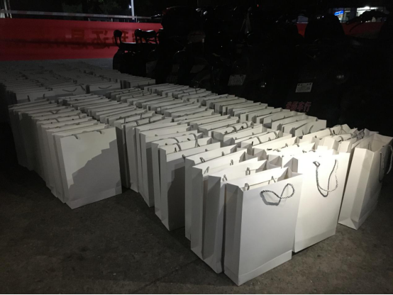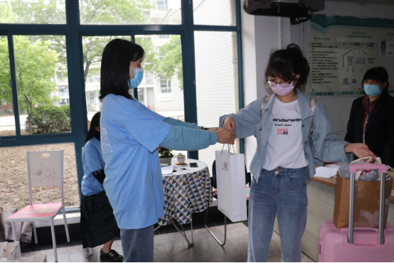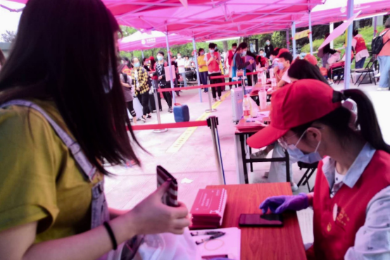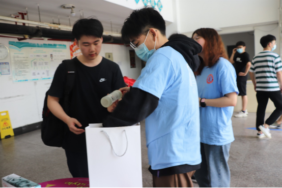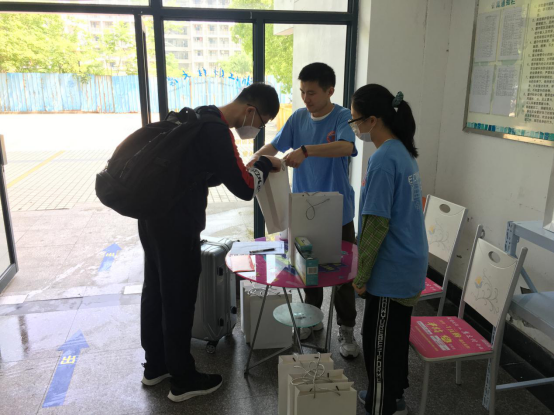 公司志愿者们也静候在各寝室大楼,等待着同学们的归来,为他们送上“防疫暖心包”。