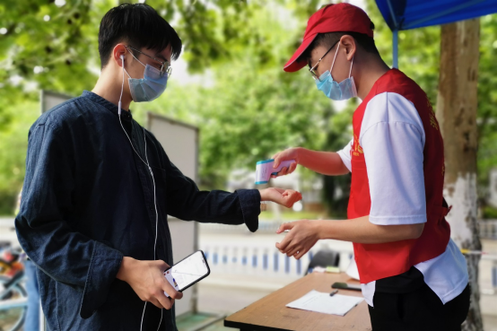 5月8日至10日,志愿者们为同学的安全返校贡献力量。园区门口,部分参加校志愿者的同学们坚守岗位,测量返校同学体温,仔细核对健康码,保障同学们有序进入园区。