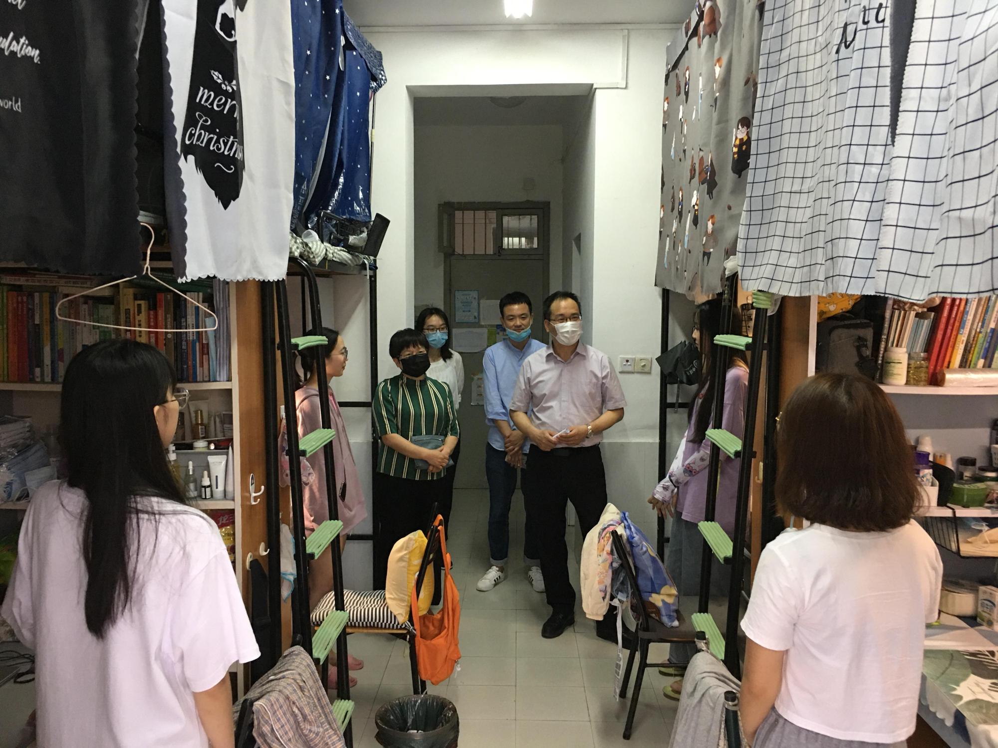 5月20日下午,公司党委副书记余建森在院相关领导和辅导员的陪同下走访了员工生活园区桃李苑5幢员工寝室,走访看望了公司18经贸4班员工。