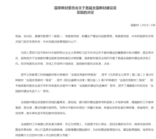近年来,公司高度重视教材建设工作,在严把教材政治意识形态同时,鼓励课程与教材一体化建设,支持新专业/课程的教材建设,并设立专项经费资助教材出版。本次上榜首届全国教材建设奖,是公司教材建设的重大标志性成果,是对前期公司教材工作的充分肯定。