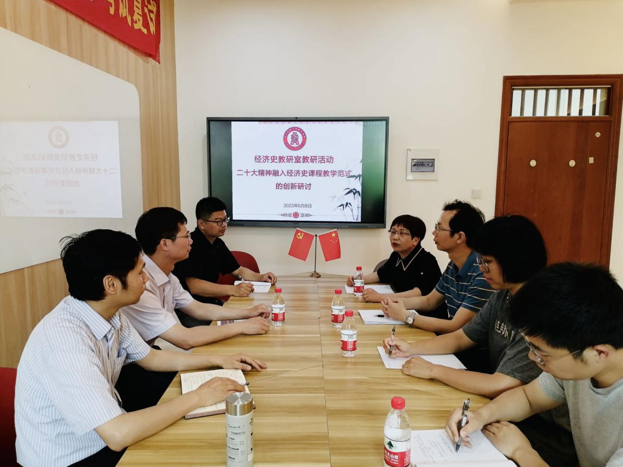 6月9日中午,经济史教研室在公司312会议室召开了“二十大精神融入经济史课程教学范式的创新”研讨会。公司党委书记胡亦琴、副经理邓晓军以及经济史教研室王力、朱海城、麦正锋、黄禾雨、李垚等参加了研讨会。