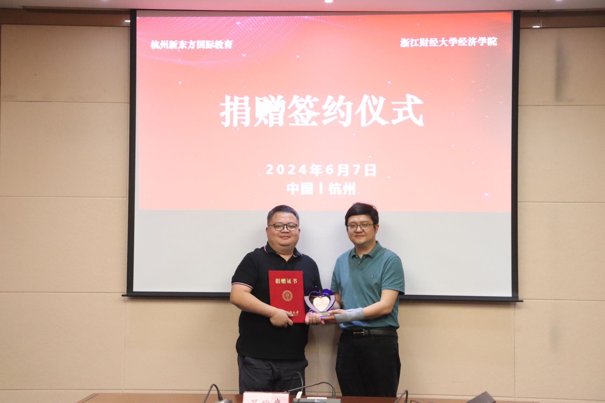 随后,罗俊经理代表公司接受了新东方国际教育总经理贺锐奇的捐赠支票。徐奇伟书记向新东方国际教育总经理贺锐奇颁发捐赠证书和捐赠奖杯。