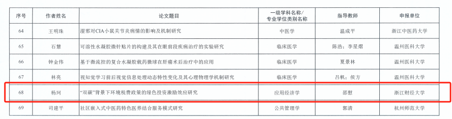 近日,浙江省研究生教育学会公布了2023年浙江省优秀博士和优秀硕士学位论文评选结果。公司在评选中再创佳绩,共2篇学位论文入选。邵慰老师指导的博士学位论文《“双碳”背景下环境税费政策的绿色投激励效应研究》(员工:杨珂)获评浙江省优秀博士学位论文提名论文;罗俊老师指导的硕士学位论文《政府补贴:市场规模与企业创新行为——一个基于高新技术产业的实验研究》(员工:戴瑞楠)获评浙江省优秀硕士学位论文。其中,杨珂的博士学位论文是全省唯一入选的应用经济学一级学科优秀博士学位论文提名论文。本次全省共评选122篇优秀硕士学位论文,理论经济学入选2篇,戴瑞楠的硕士学位论文为其中之一。