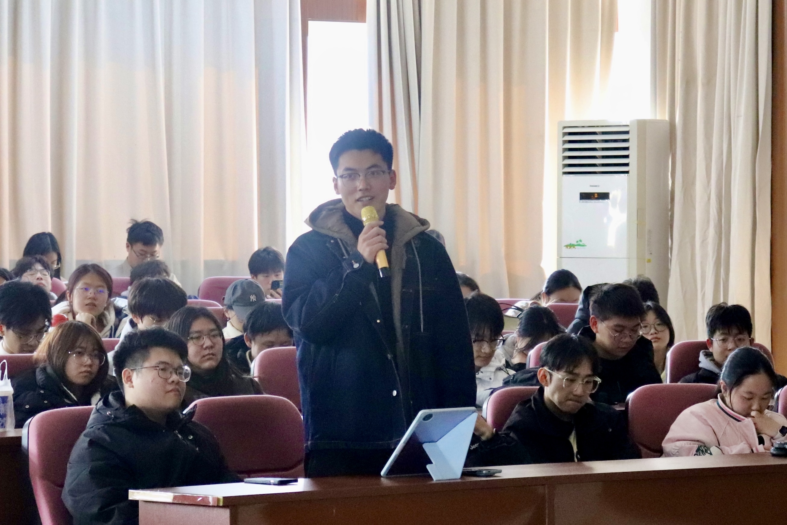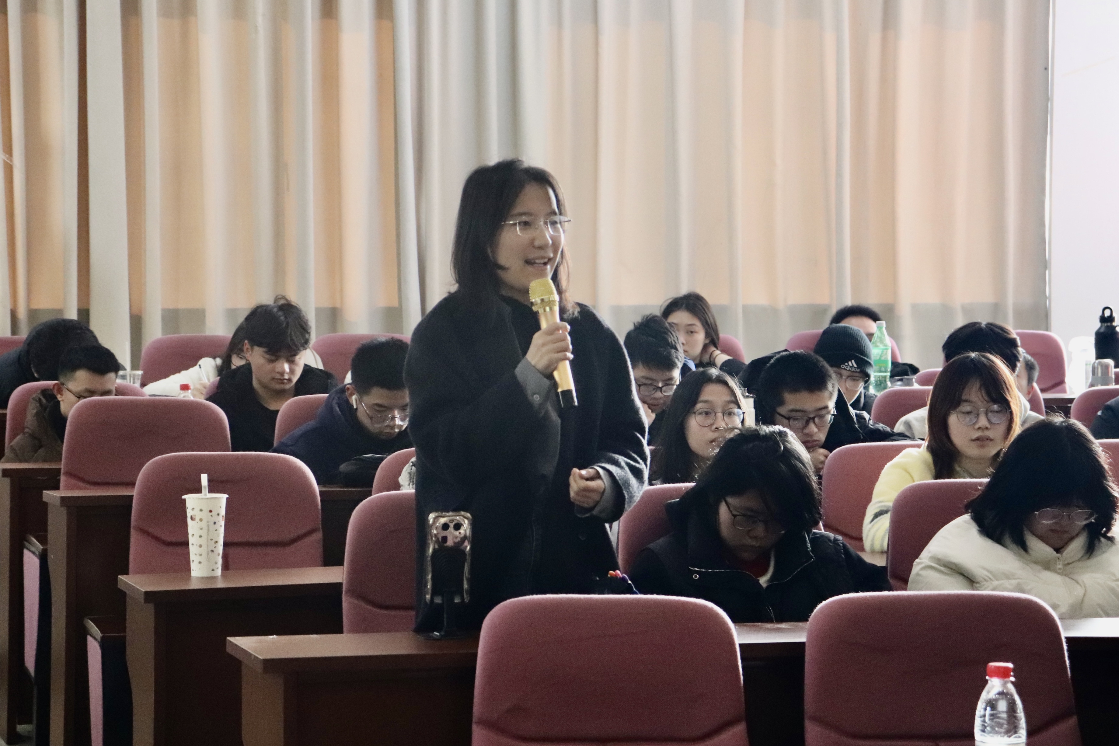 在交流互动环节,来自24数字贸易创新1班陈庆煜认为旅行和记录生活能够让自己感到幸福,并和大家分享了自己的幸福密码。23经济学创新班的刘小鸣认为能够从文学和历史相关书籍中探寻幸福的秘诀。FUN88乐天使经理罗俊和朱西湖老师针对同学们的回答展开了进一步的探讨。