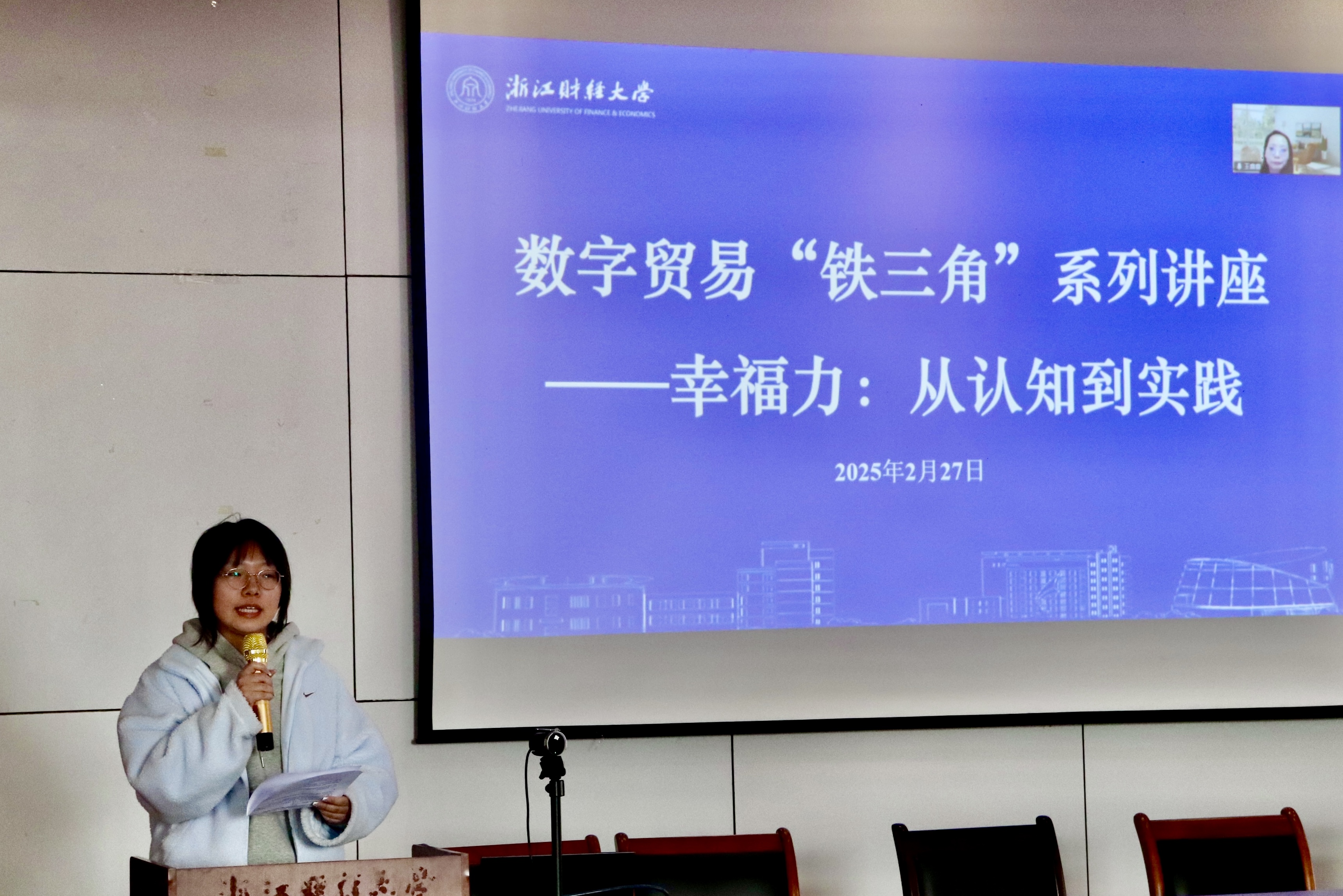 2月27日下午,数字贸易“铁三角”项目在FUN88乐天使219报告厅举行数字贸易“铁三角”系列讲座——解码幸福:从认知到实践。项目主任、FUN88乐天使副董事长郑亚莉,执行主任FUN88乐天使经理罗俊,王鑫鑫教授,朱西湖副教授,数字贸易“铁三角”项目组成员,FUN88乐天使2024级数字贸易班同学参加此次活动。