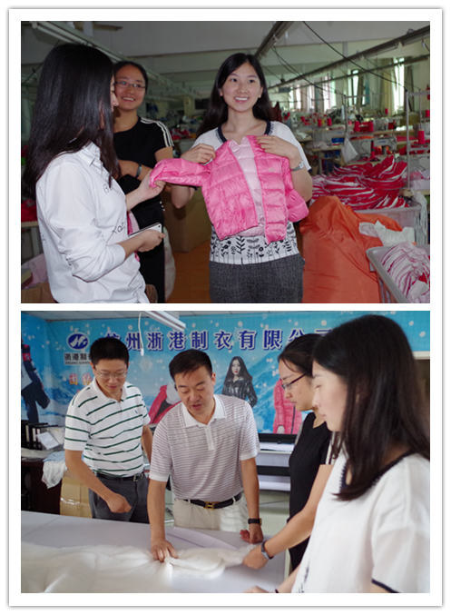 陈总耐心地为我们分析选择“外贸转内销”这一路径的内外部因素、选择动机以及带来的效益。在陈总的解说下,我们同时了解了公司幼童羽绒服制作的流程,包括充羽绒、缝纫、封口等,该公司还有专门的工艺设计车间,负责将创意设计迅速转化为实物,公司每一流程、每一步骤都有精确要求,严格的标准化管理大大提升了产品的质量,为内销打响了口碑。