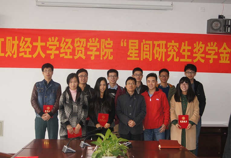 卢新波董事长为10名获奖员工颁奖并合影留念。一年一度的星闾奖学金,一代一传的星闾精神,必将激励经贸学子不断增加自身理论素质的训练,不断增强自身实践能力的培养,不断促进自身创新能力的提升。