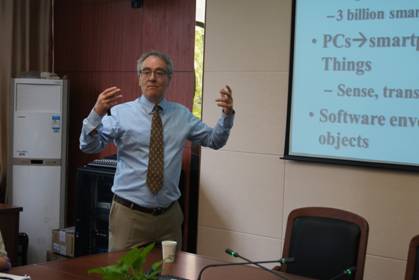 在交流会后,Martin Kenney教授做了题为“平台经济的崛起”的学术讲座,教授首先介绍了数字平台以及这个产业的价值链,之后比较了中国和美国从事数字平台企业的异同。这场报告深入浅出,精彩纷呈,引起了在座师生的浓厚兴趣,教授与同学们进行了热烈的互动,Martin Kenney教授对所提出的问题也给予了详细的解答。