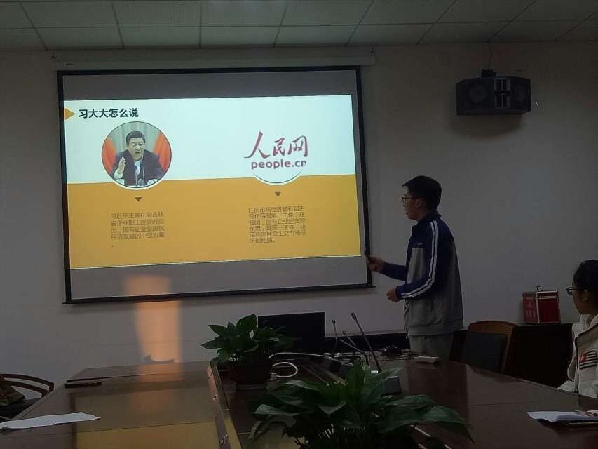 15级“现代经济学实验班”代表队为我们带来的《市场经济与国有企业的兼容性》,从三个方面就市场经济与国有企业是否兼容做了详细的介绍,并分析了国有企业未来的改革趋势。展示完毕后,在提问环节中,两位同学与一位在场观众就国有企业和民营企业在市场资本上的问题展开了讨论交流,气氛热烈。