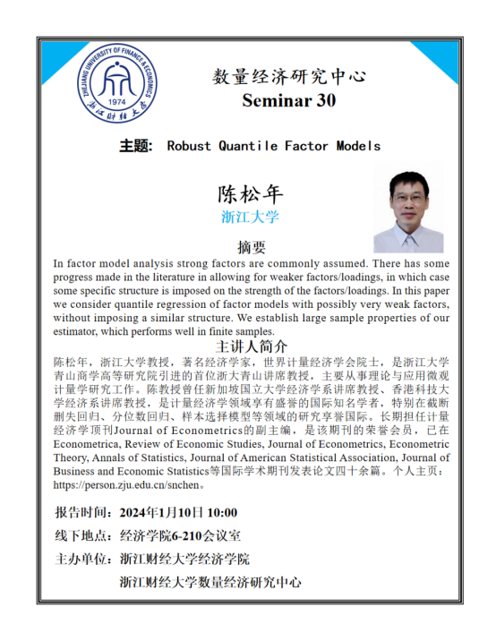 陈松年,浙江大学教授,著名经济学家,世界计量经济学会院士,是浙江大学青山商学高等研究院引进的首位浙大青山讲席教授,主要从事理论与应用微观计量学研究工作。陈教授曾任新加坡国立大学经济学系讲席教授、香港科技大学经济系讲席教授,是计量经济学领域享有盛誉的国际知名学者,特别在截断删失回归、分位数回归、样本选择模型等领域的研究享誉国际。长期担任计量经济学顶刊Journal of Econometrics的副主编,是该期刊的荣誉会员,已在Econometrica, Review of Economic Studies, Journal of Econometrics, Econometric Theory, Annals of Statistics, Journal of American Statistical Association, Journal of Business and Economic Statistics等国际学术期刊发表论文四十余篇。个人主页:https://person.zju.edu.cn/snchen。