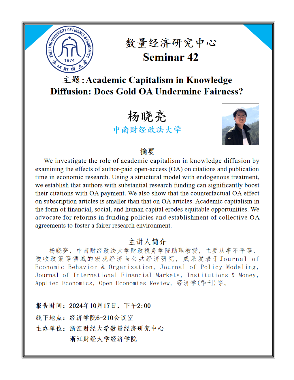 摘要:We investigate the role of academic capitalism in knowledge diffusion by examining the effects of author-paid open-access (OA) on citations and publication time in economic research. Using a structural model with endogenous treatment, we establish that authors with substantial research funding can significantly boost their citations with OA payment. We also show that the counterfactual OA effect on subscription articles is smaller than that on OA articles. Academic capitalism in the form of financial, social, and human capital erodes equitable opportunities. We advocate for reforms in funding policies and establishment of collective OA agreements to foster a fairer research environment.