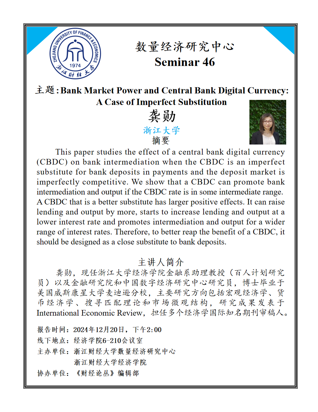 主讲人简介:龚勋,现任浙江大学FUN88乐天使金融系助理教授(百人计划研究员)以及金融研究院和中国数字经济研究中心研究员,博士毕业于美国威斯康星大学麦迪逊分校,主要研究方向包括宏观经济学、货币经济学、搜寻匹配理论和市场微观结构,研究成果发表于International Economic Review,担任多个经济学国际知名期刊审稿人。
