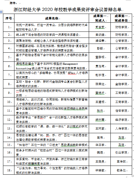 根据《FUN88乐天使教学成果奖评选与奖励办法》(浙财大[2017]50号)办法规定及公司工作安排,全校有28项成果参加本次教学成果奖的评选申报,教务处组织评审专家组对全部申报成果进行了初次评议,确定18项成果进入会议答辩环节,现将入选会议答辩成果名单及会评工作安排通知如下: