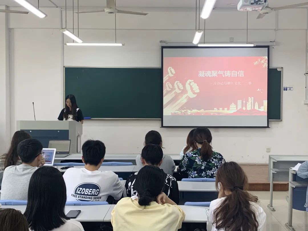 随后,支部成员结合实践,就感悟最深的采访实录内容进行了讨论。何欣雨围绕湖州安吉县重点关闭污染企业,大力发展生态经济、旅游经济的举措,分享了习近平总书记关于“两山论”的重要论述。王静怡讲述了习近平总书记在浙江工作期间多次前往文化遗址进行考察的事迹。在习近平总书记的关注与领导下,浙江加快从文化大省向文化强省迈进。