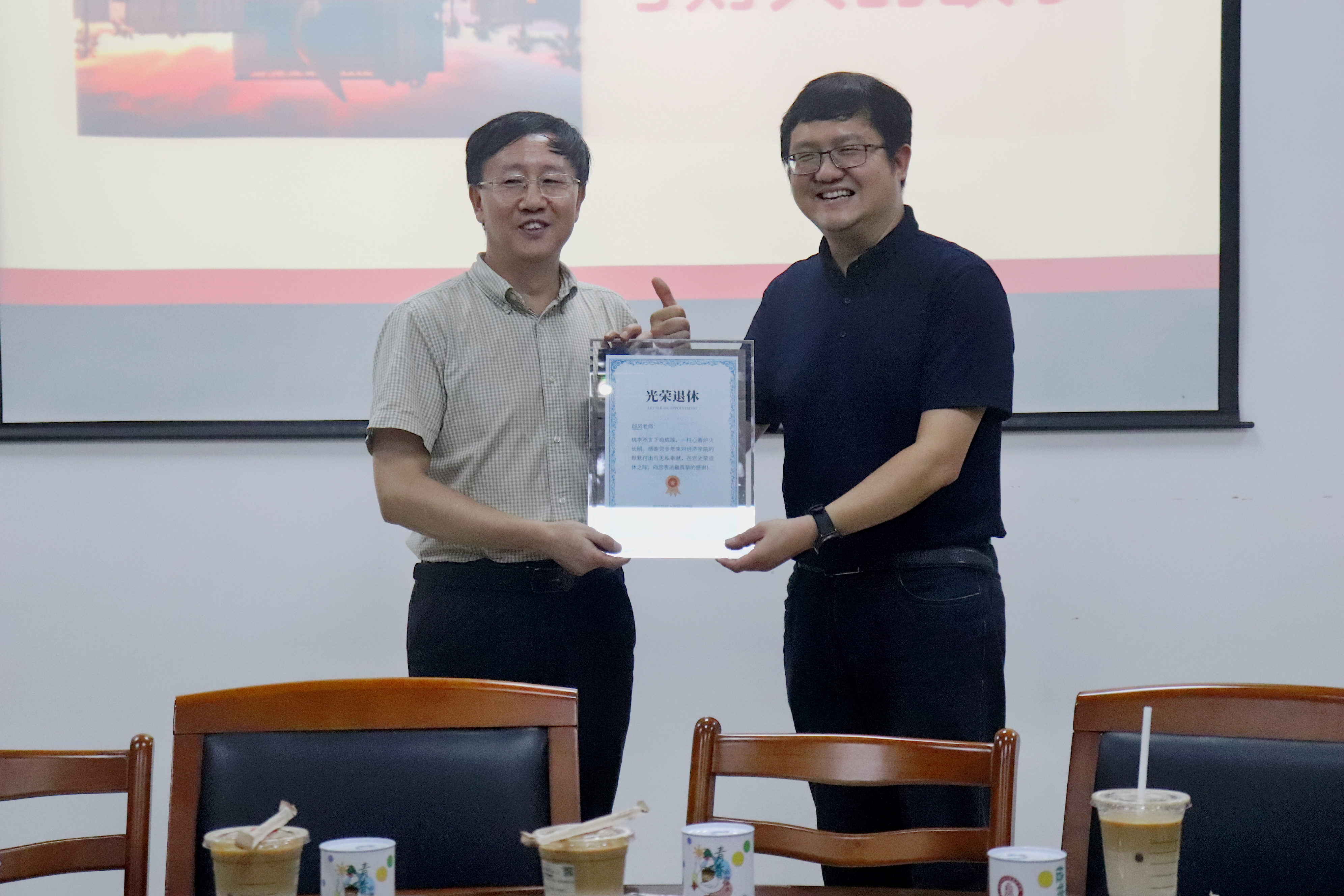 荣休仪式上,徐奇伟书记和罗俊经理分别为邱风老师送上荣休纪念证书和鲜花,并合影留念。