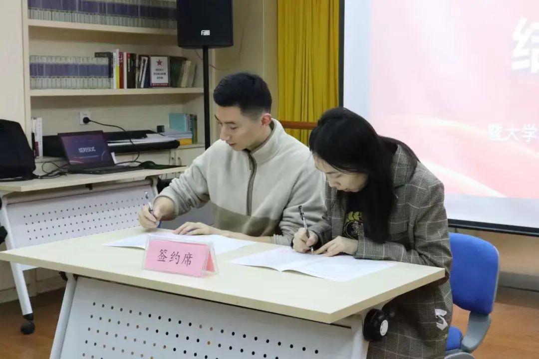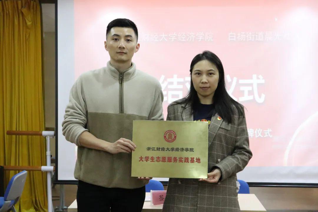随后,公司团委书记曹仲晔与晨光社区团支部书记吴媛红上台签订了老员工社会实践基地协议书,共同完成了挂牌仪式,并合影留念。