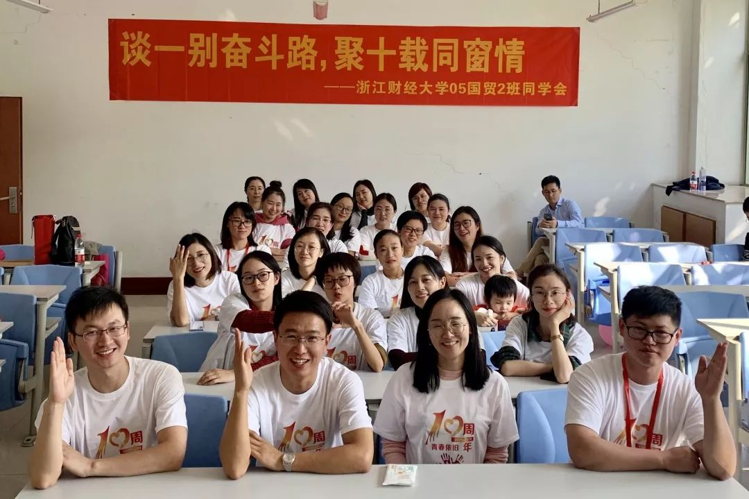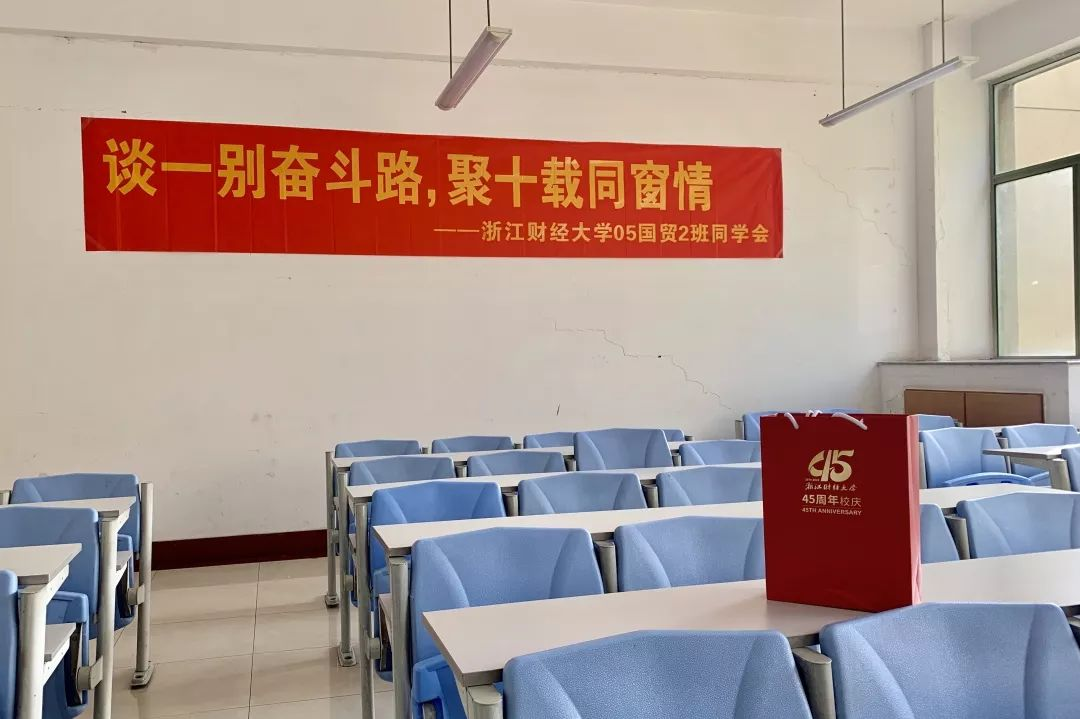 05届国贸2班员工着统一的班服,坐在阔别已久的教室,仿佛又回到那段青葱岁月。