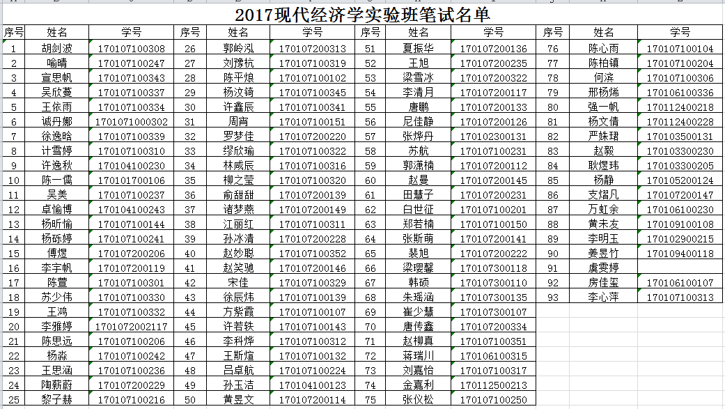 经资格审核,现公布2017级现代经济学实验班笔试名单,请携带身份证参加笔试。