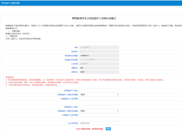①员工登陆教务管理系统,按照自愿原则,在“信息维护--员工监护人信息采集”中填写父母或监护人信息。员工可以填报父母双方信息,也可以只填报一方信息。填写完成后点击提交。