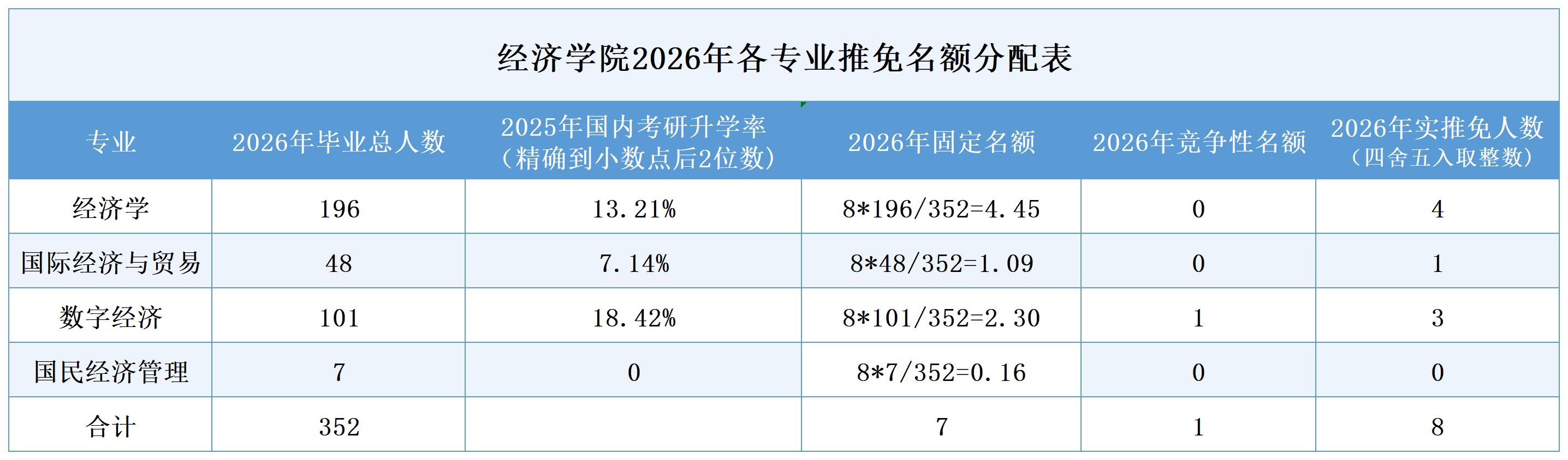 固定名额按照“公司推免名额/公司当年应届本科毕业生人数”得到的值作为公司推免名额的计算基数。公司固定名额共7人,其中经济学专业4人,国际经济与贸易专业1人,数字经济专业2人。剩余1人为竞争性名额,该名额优先分配给上一年度国内考研升学率最高的专业,公司2021级4个专业国内考研升学率最高专业为数字经济专业,因此该专业可推荐1位符合条件的员工参与竞争,原则上根据员工在本专业综合成绩排序(精确到小数点后2位)。