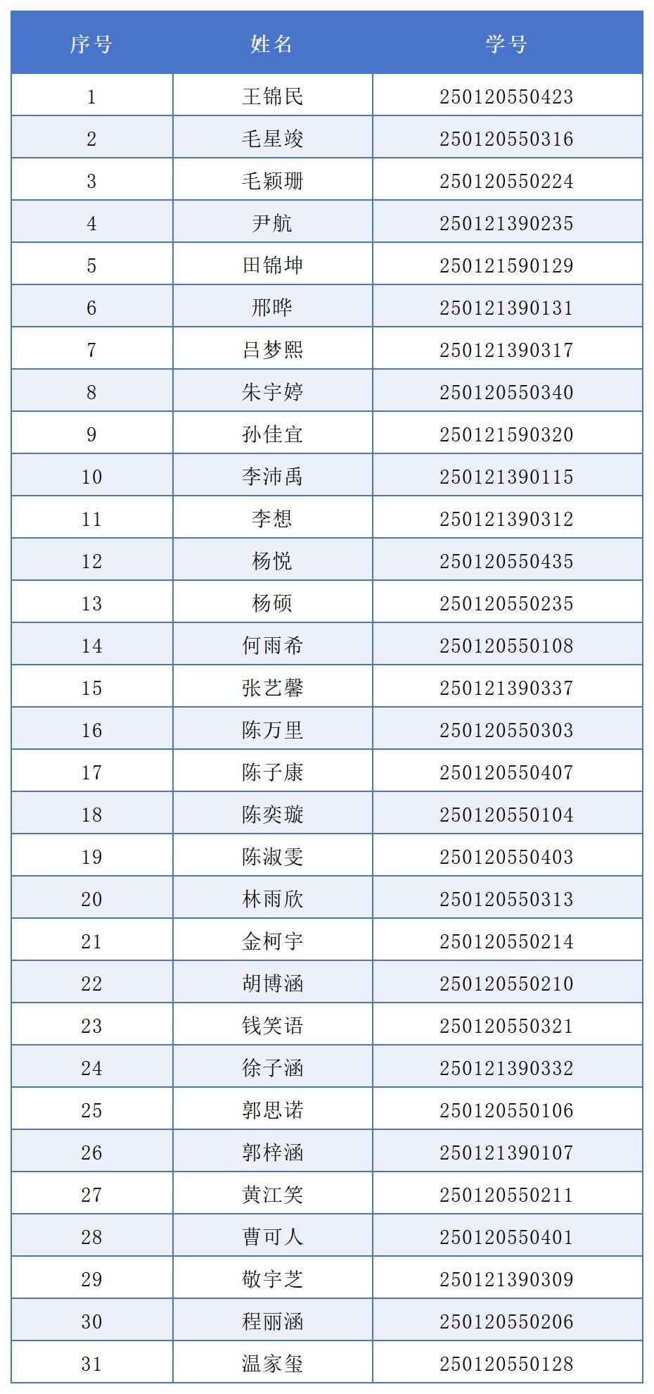 按照《关于经济学拔尖员工培养基地班2025级新生选拔的通知》相关规定,经自愿报名、入围筛选、综合面试、成绩复核以及面试工作领导小组审议,公司2025级经济学拔尖员工培养基地班预录取以下31人(并列30名),现对预录取名单进行公示(按姓氏笔画排序)。